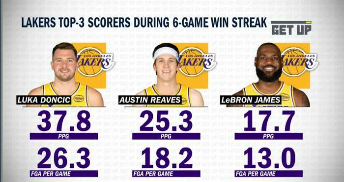 03-18 湖人6连胜期间詹姆斯得分出手均列队内第三,东契奇两项数据为其两倍