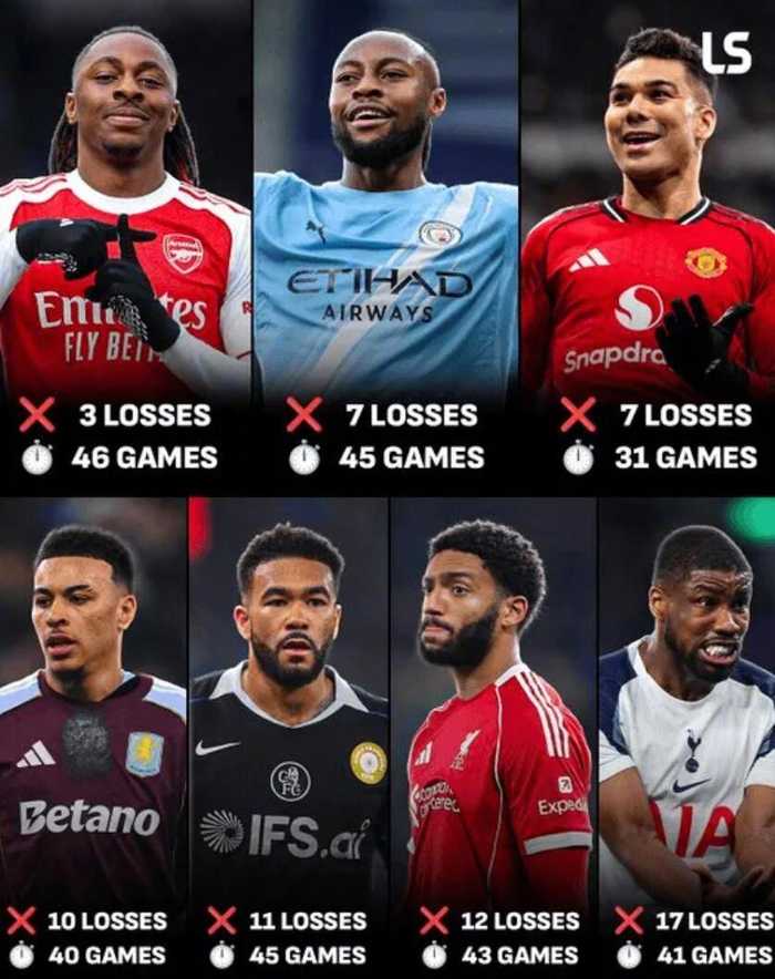 相比之下,曼城和曼联均输掉7场比赛,而维拉(10场)、切尔西(11场)、利物浦(12场)和热刺(17场)输球场次更多。